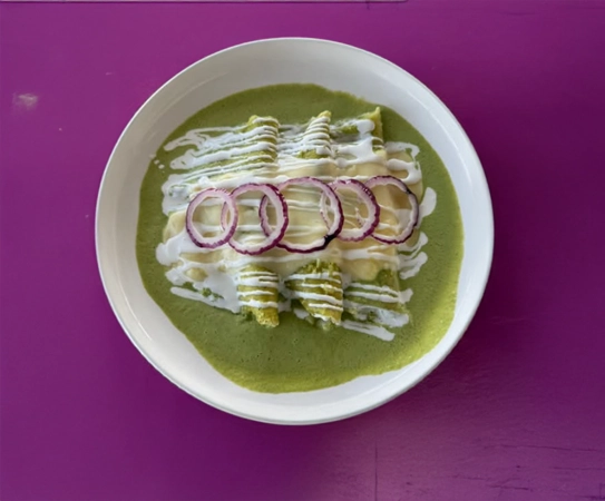 Tortillas de maíz rellenas de jugoso pollo, nadando en un baño cremoso de salsa verde y gratinadas con queso manchego derretido.