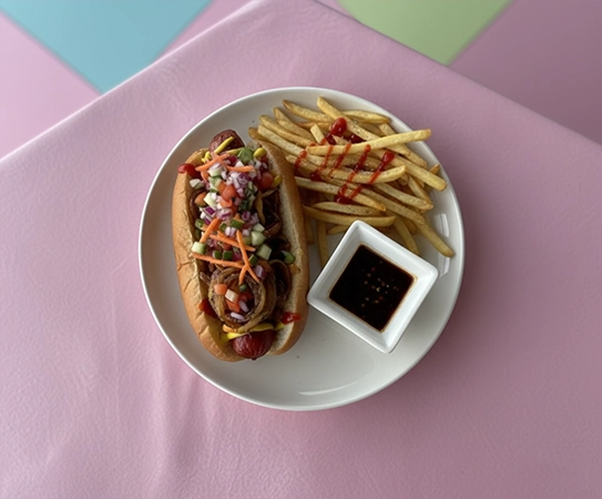 Una jugosa salchicha de res envuelve en nuestro suave pan artesanal y se cubre con una irresistible costra crujiente de queso gouda gratinado. Acompañado de cebolla caramelizada, verduras y aderezos y papa a la francesa.