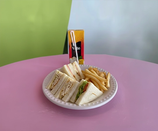 Tripleta de mini sandwiches (pollo, jamón-queso, verduras). Incluye papas a la francesa y jugo.