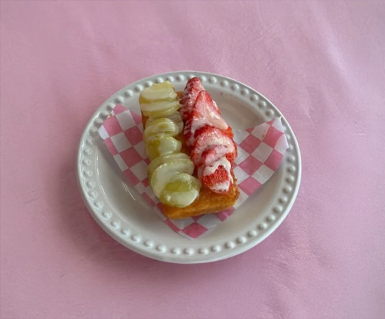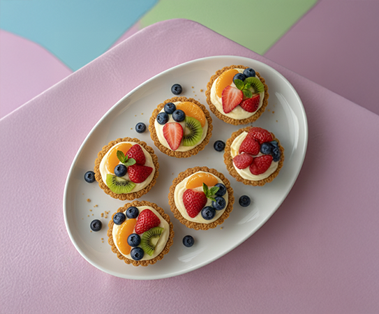 Cada miniatura combina una base crujiente de galleta con una suave crema pastelera y se corona con un colorido arreglo de frutas frescas de temporada.
