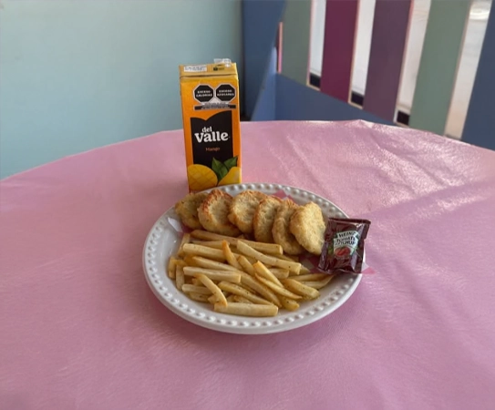 Crujientes piezas de pollo empanizado. 6 piezas, incluye papas a la francesa y jugo.