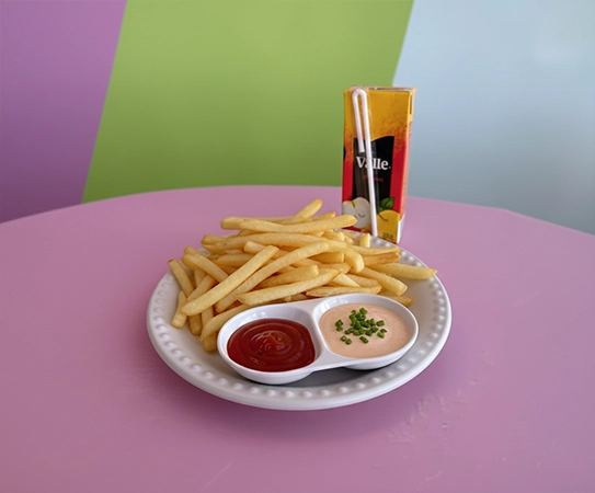 Papas crujientes, acompañadas de catsup o aderezo y jugo.