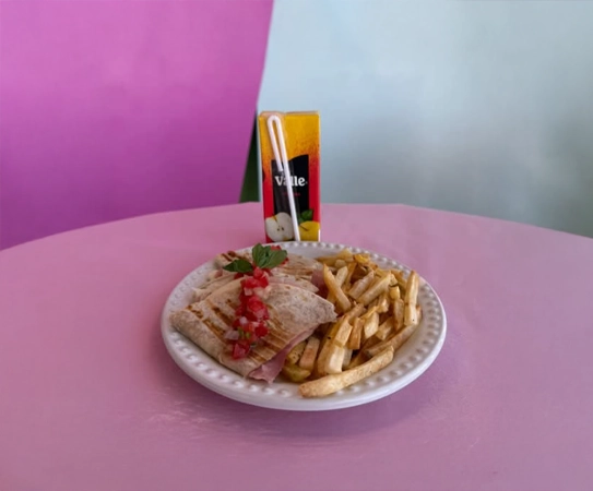 Tortilla de harina con jamón y queso derretido. Incluye papas a la francesa y jugo.