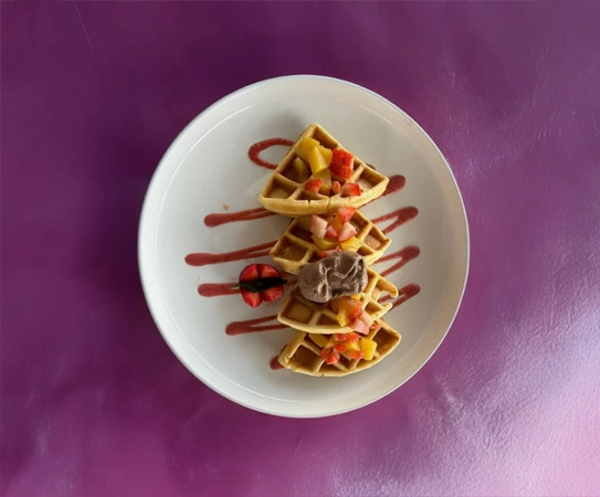 Waffle crujiente, acompañado de una bola de helado a elegir y fruta fresca de temporada. Elige tu topping dulce favorito para hacerlo único.